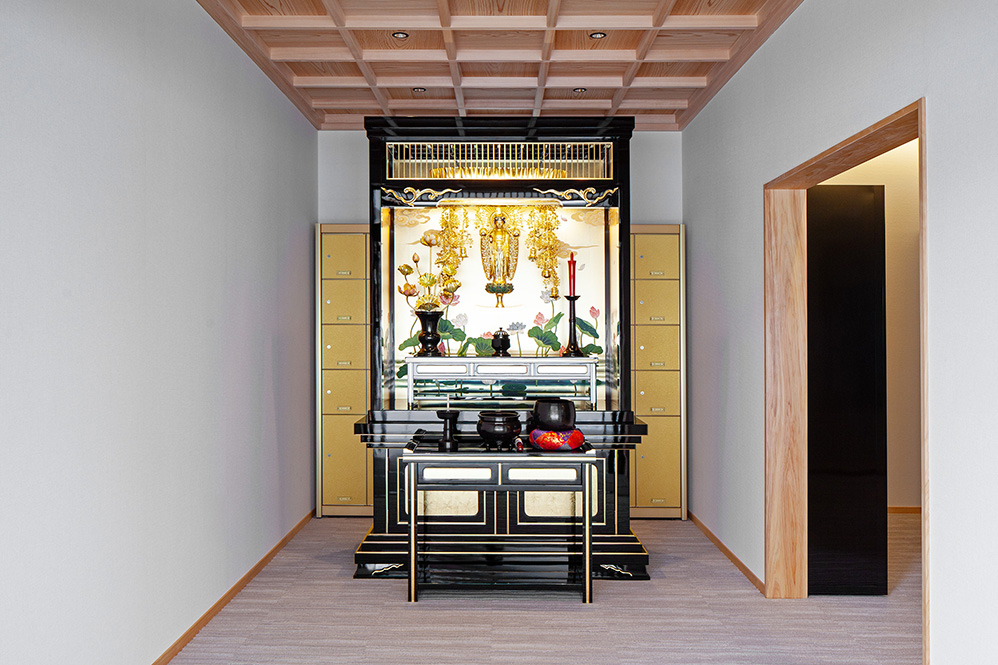 外観は要望通りのむくり屋根、バリアフリーの長い車椅子用スロープを経て、玄関ホール正面に御内仏、隣室にアルミ製の納骨壇が並ぶ動線計画、間接照明を主とした照明計画、そして天井は銀紙貼りという、どれにしても既存納骨堂とはまったく異なった素晴らしい建物となりました。